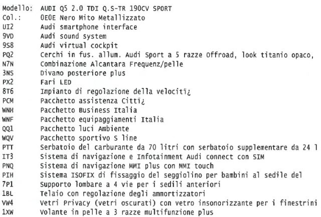 OPTIONAL AUDI Q5- Allestimento Sline dentro e fuori- Sedili sportivi pelle alcantara- Vetri acustici- Impianto audio SoundSystem con subwoofer e 9 casse- Sistema MMI plus con navigatore satellitare- Ammortizzatori autolivellanti- Serbatoio carburante maggiorato- Cerchi da 20 pollici diamantatiSENZA DIFETTI E GOMMATA PRATICAMENTE A NUOVO
