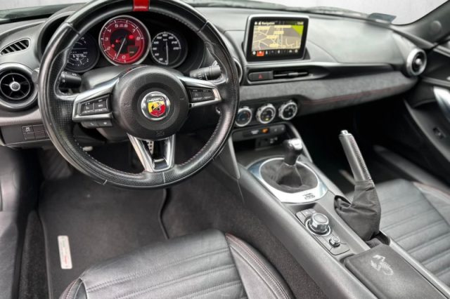 Chiave con transponder, Pretensionatore cinture, Cambio manuale a 6 marce, ABS + EBD, Correttore assetto fari, Servosterzo, Bracciolo sedili anteriori, Regolazione altezza sedile guida, Volante in pelle con mirino rosso, Volante regolabile in altezza, Pomello cambio in pelle, Pedaliera sportiva in alluminio con acceleratore incernierato in basso, Quadro strumenti sportivo con contagiri in posizione centrale e sfondo rosso, Alzacristalli elettrici automatici, Cruise control, Chiave elettronica Keyless Go con pulsante Start, Climatizzatore manuale, Specchietti regolabili elettricamente, Capote isolante doppio strato con lunotto antirumore e parabrezza acustico, Vano portaoggetti con serratura, Paraurti sportivi, Minigonne con inserto nero, Cover Rollbar color Grigio Forgiato, Cornice parabrezza color Grigio Forgiato, Badge Abarth laterali, Maniglie in tinta carrozzeria, Radio AM/FM e MP3 player con porte USB e AUX con comandi audio integrati al volante, Computer di bordo, Abarth D.A.M. - Differenziale Autobloccante Meccanico, Assetto sportivo: ammortizzatori Bilstein, molle a taratura specifica, barre antirollio maggiorate, Barra duomi, Abarth Drive Mode Selector con modalità Sport, Cerchi sportivi Abarth Corsa 7Jx17", Controllo elettronico della stabilità e della trazione, TPMS (sistema di monitoraggio pressione pneumatici), Airbag frontali, Airbag laterali, Cofano attivo con sistema di protezione del pedone, Attacchi Isofix, Luci diurne (DRL), Fendinebbia, Fari posteriori a LED, Fari con funzione follow me home, Immobilizer, Kit di riparazione pneumatici Fix&Go, Vernice metallizzata Nero San Marino 1972, Pack Scorpione, Sedile sportivo Abarth in Pelle e microfibra