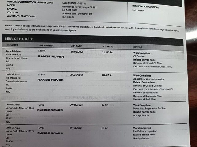 LAND ROVER RANGE ROVER EVOQUE II 2.0d i4 MHEV R-DYNAMIC SE AWD AUTOCARRO: 01/2023, KM 60.000 TAGLIANDATI LAND ROVER, BIANCO (FUJI WHITE), INT. PELLE NERA, BLACK PACK (TETTO, SPECCHI, GRIGLIE, FREGI, CERCHI E PROFILI NERI), CAMBIO AUTOMATICO/SEQUENZIALE 9 RAPPORTI, FARI FULL LED, NAVIGATORE SATELLITARE TOUCH SCREEN, TERRAIN RESPONSE, CERCHI IN LEGA 18 NERO LUCIDO, PORTELLONE POSTERIORE AUTOMATICO, SENSORI PARCHEGGIO ANTERIORI E POSTERIORI CON RETROCAMERA, VETRI PRIVACY, SENSORE PRESSIONE PNEUMATICI, IMPIANTO HI-FI MERIDIAN CON USB ED MP3, VOICE CONTROL, VOLANTE MULTIFUNZIONE IN PELLE, CONTROLLO AUTOMATICO VELOCITA? DISCESA/SALITA, SISTEMA CONTROLLO VELOCITA? ASL, SPECCHIETTI RIPIEGABILI ELETTRICAMENTE, SENSORE LUCI E PIOGGIA, BLUETOOTH CON APPLE CARPLAY/ANDROID AUTO, COMPUTER DI BORDO, CRUISE CONTROL ADATTIVO, CLIMATIZZATORE AUTOMATICO BI-ZONA, ANTIFURTO DI SERIE E PERIMETRALE, TASTO PER CHIAMATA EMERGENZA E SOCCORSO, AUTOVETTURA UFFICIALE, UNICOPROPRIETARIO, MOTORIZZAZIONE IBRIDA DIESEL/ELETTRICA, EURO 6D/TEMP CON F. AP., PIU? CHE OTTIME CONDIZIONI GENERALI, IMMATRICOLATA AUTOCARRO!!