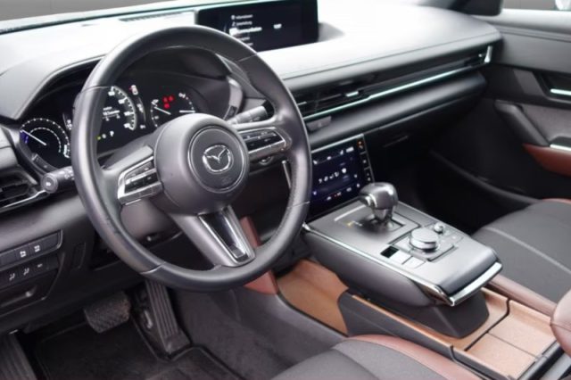 Illuminazione interna a LED, 8 altoparlanti, Sistema di mantenimento della carreggiata (LAS), Controllo automatico degli abbaglianti (HBC), Strumentazione centrale digitale con display da 7", 2xUSB, Cambio automatico, Cavo di ricarica domestica Mode 2 Type 2 (per ricarica con presa casalinga), Cavo di ricarica Mode 2 Type 3 (per ricarica con wallbox e colonnine), Fari diurni a Led, Fari Led a matrice (ALH), Impianto audio Mazda Harmonic Acoustics con radio digitale DAB, Mazda Connect con display centrale a grafica TFT a colori da 8,8", Navigatore satellitare, Plancia centrale con comandi a sfioro, Rivestimenti interni "Modern Confidence" o "Industrial Vintage", Sensore luce/pioggia, Sistema antifurto perimetrico, Sistema di frenata automatica negli incroci (TAT), Plancia centrale portaoggetti rivestita in sughero, Presa 12V, Sedili in tessuto nero/grigio chiaro, Bracciolo centrale anteriore e appoggiabraccia portiere con cuciture a vista, Finiture interne cromate, Plancia centrale rivestita con cuciture a vista, Presa corrente 150W, Rivestimento interno maniglie portiere in sughero, Airbag anteriore ginocchia lato guidatore, Frenata automatica di emergenza anteriore (SBS), Sedile guida regolabile elettricamente, Montanti centrali Nero Lucido, cornice sup. "Dark" o "Silver", placca satinata "MAZDA" su montante C, Retrovisore esterno lato guida fotocromatico, Chiave con transponder, Correttore assetto fari, Immobilizzatore, Pretensionatore cinture, Tergilunotto, Appoggiatesta posteriori, Sedile guida regolabile in altezza, Servosterzo, Indicatore temperatura esterna, Climatizzatore automatico, Airbag a tendina (anteriori e posteriori), Sensore pressione pneumatici (TPMS), Sedile posteriore abbattibile 60/40, Smart Key, Vetri posteriori scuri, HMI Commander, Videocamera posteriore, ABS, Controllo elettronico della trazione, Controllo automatico velocità, Sensore luci, Bluetooth, Bracciolo centrale anteriore, Fari posteriori a LED, Hill Hold Assist (assistente alla partenza in salita), Retrovisori esterni ripiegabili elettricamente, Airbag laterali (guidatore e passeggero), Sedili anteriori riscaldabili elettricamente, Sensori di parcheggio anteriori e posteriori, Sistema rilevazione stanchezza guidatore (DAA), Bracciolo centrale posteriore, Lavafari ad alta pressione, Retrovisori esterni riscaldabili e regolabili elettricamente, Volante multifunzione rivestito in pelle, Sistema di monitoraggio angoli ciechi (BSM) + Rear Cross Trafic Alarm,