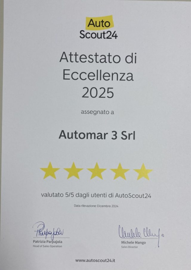 Tutte le Nostre auto hanno il chilometraggio garantito e certificato. Fidatevi di chi da decenni vende automobili! Gli accessori e le specifiche tecniche riportate in questa scheda sono da considerarsi puramente indicative. Nonostante gli sforzi fatti per garantire l'accuratezza delle informazioni precedenti, potrebbero essere presenti alcune imprecisioni. È importante non affidarsi a tali informazioni e controllare presso il Nostro punto vendita qualunque elemento o aspetto che potrebbe influenzare la vostra decisione di acquistare il veicolo. Eventuali incongruenze tra le caratteristiche presentate nella scheda descrittiva e le effettive dotazioni del veicolo non sono imputabili alla nostra volontà e non costituiscono in alcun modo un vincolo contrattuale per il venditore.