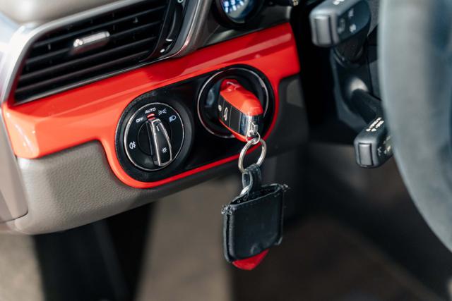 Volante in Alcantara con il punture in contrasto di colore rosso e puntatore di colore Rosso